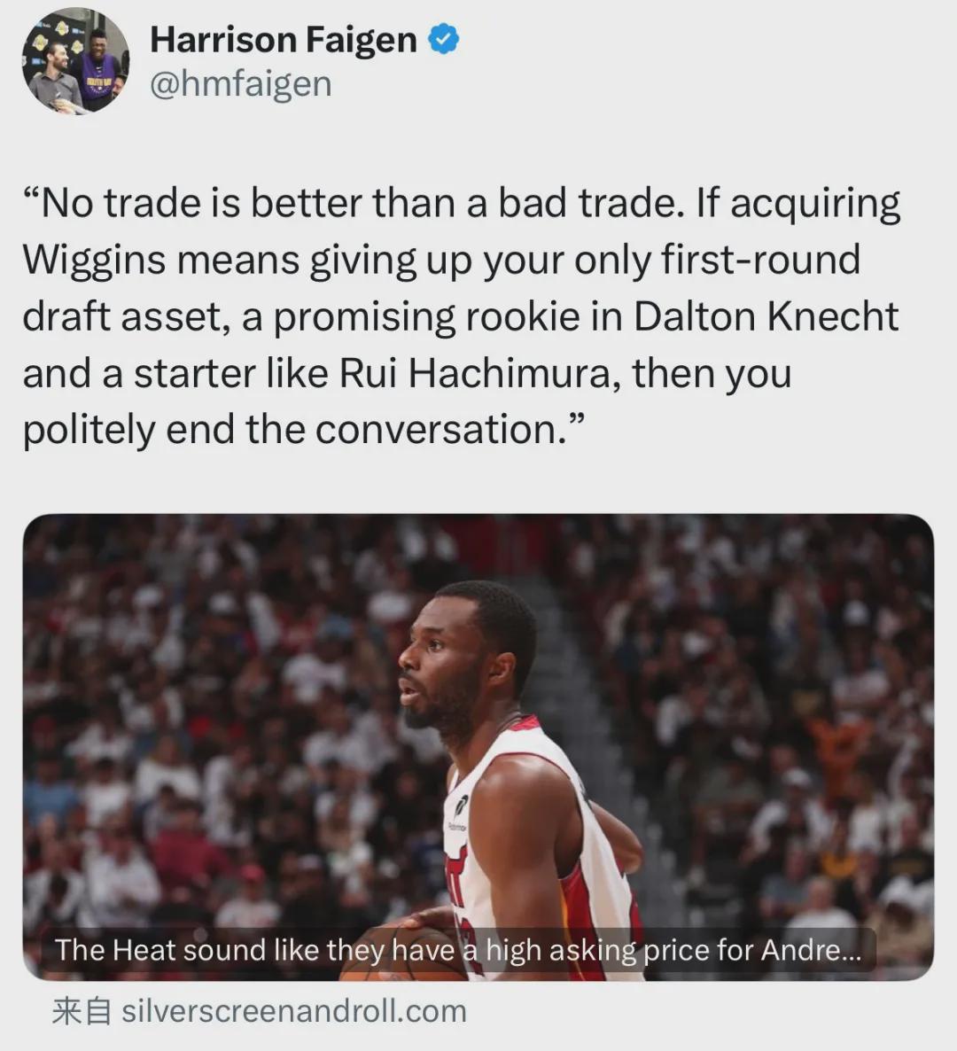 现湖人记者Faigen对此发表评论:没交易好过烂交易,如果对方过于狮子大开口,那么就该礼貌结束谈话。