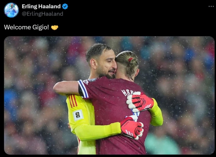 曼城前锋哈兰德在社交媒体上分享了与多纳鲁马的拥抱合影,并亲切欢迎新队友:“欢迎你,吉吉奥!”